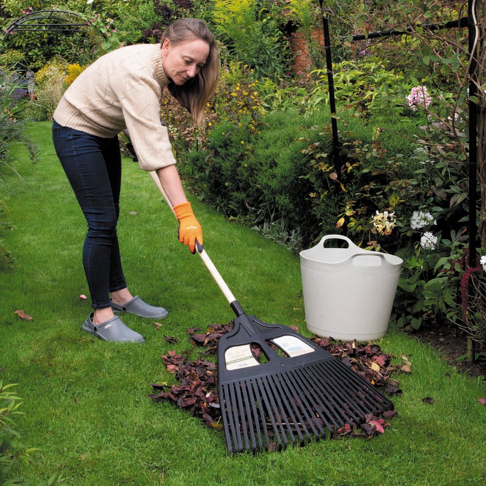 This extra-large lightweight leaf rake has long, curved tines which help to reduce clogging, for quicker and easier raking. The natural smooth wooden handle has a long handle, making reaching when cleaning more convenient & comfortable as well as saving time. ideally suited for larger volumes of autumnal leaves but a great year-round rake to speed up any debris cleaning.